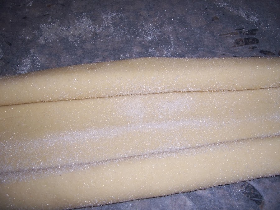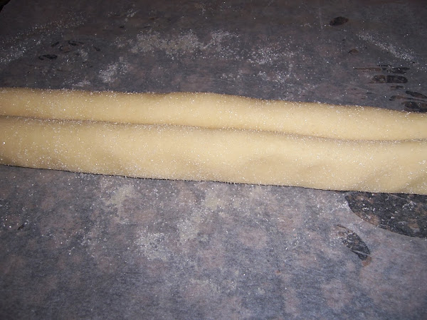 Una vez lista la espolvoreamos de azúcar por los dos lados y la enrollamos por los dos extremos al mismo tiempo hasta llegar al centro.