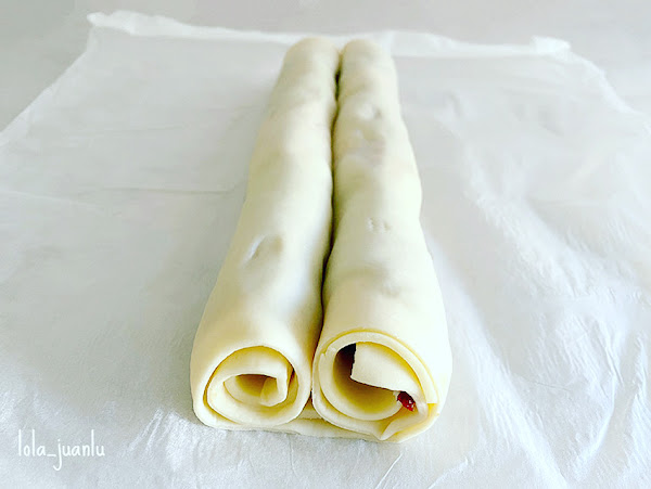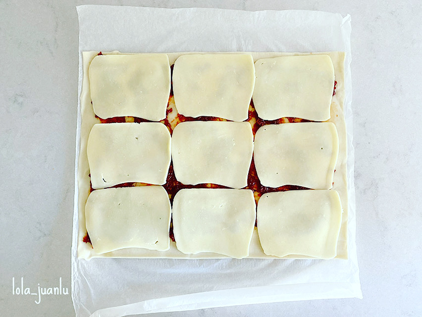 Cuando la mermelada esté fría, estiramos la base de hojaldre sobre la que extendemos la mermelada de pimientos del piquillo y, sobre ella, colocamos las lonchas de queso mozzarella. Doblamos los extremos derecho e izquierdo del hojaldre, enrollándolos de forma que se encuentren en el centro y apretamos un poquito pare que queden unidos.