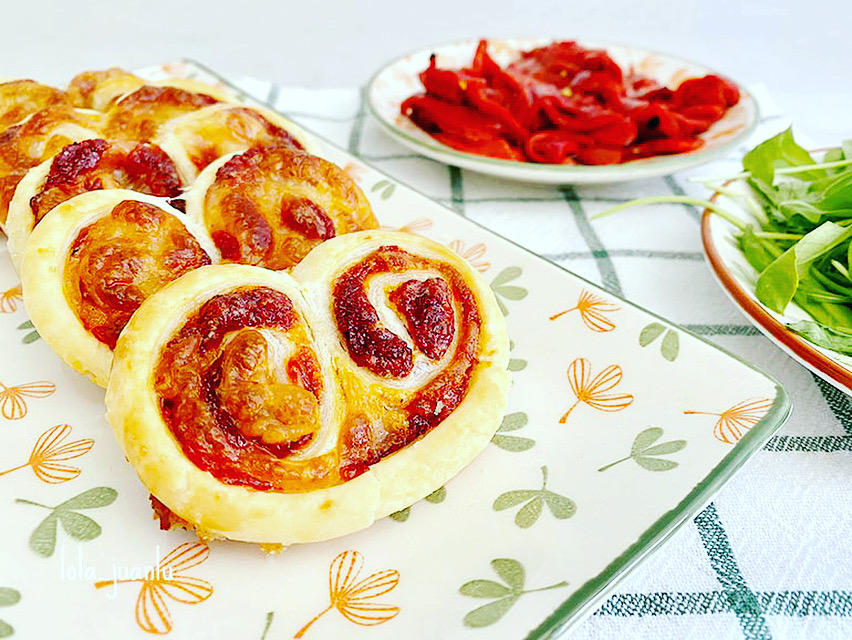 ¿Qué te parecen estas palmeritas rellenas de mermelada de pimientos del piquillo y queso mozzarella? Como dice Mary, están deliciosas y no te vas a poder resistir a comer una detrás de otra.