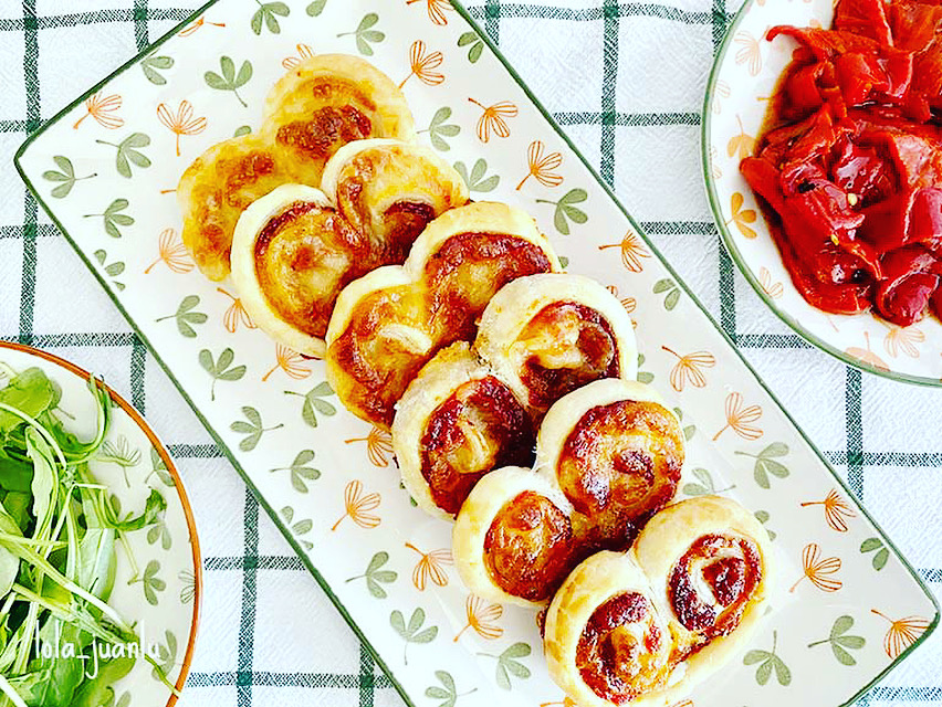 Dentro de su recetario, he elegido una receta fácil de elaborar donde se utilizan unos ingredientes que me encantan, palmeritas rellenas de mermelada de pimientos del piquillo y queso mozzarella.