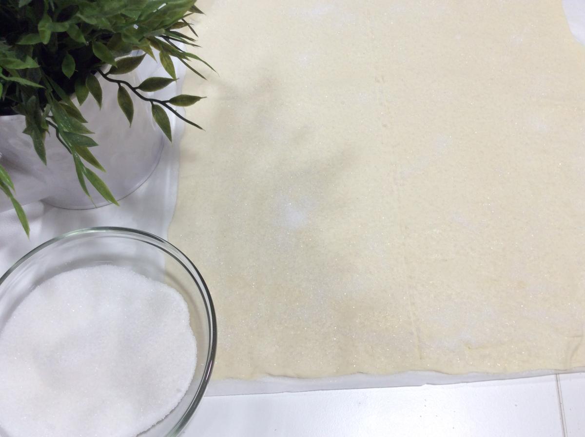 Doblamos ambos lados hacia la marca central que hiciste y vuelve a espolvorear azúcar y a pasar el rodillo (esta vez no hace falta poner canela para no saturar el sabor).