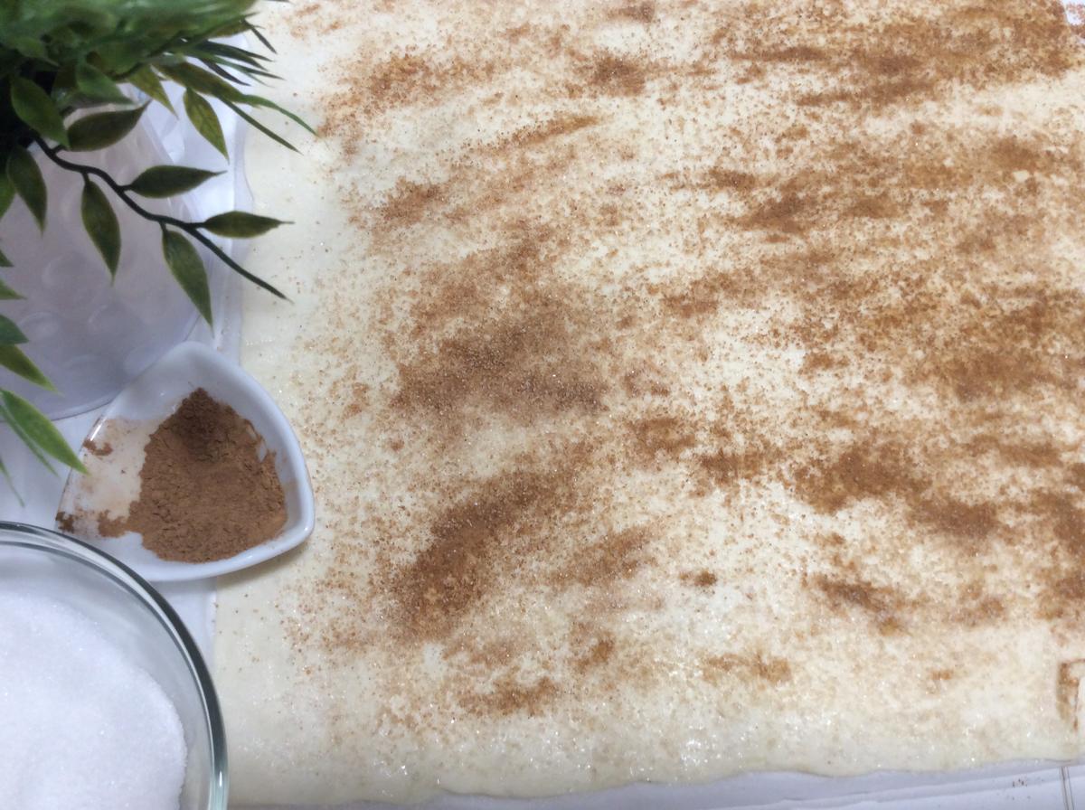 Espolvorea azúcar y canela, marca con el rodillo para que penetre en la masa.