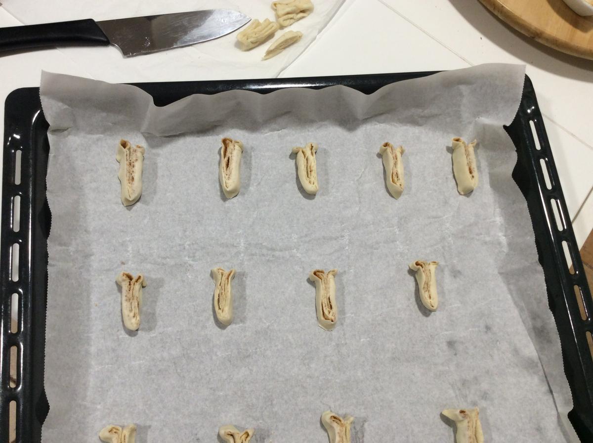 Hacemos cortes de un poco menos de un dedo de anchos , les damos forma en los bordes tal como muestro en la foto y los ponemos en la llanda sobre papel vegetal (puedes usar el mismo papel en el que venia la masa) .
