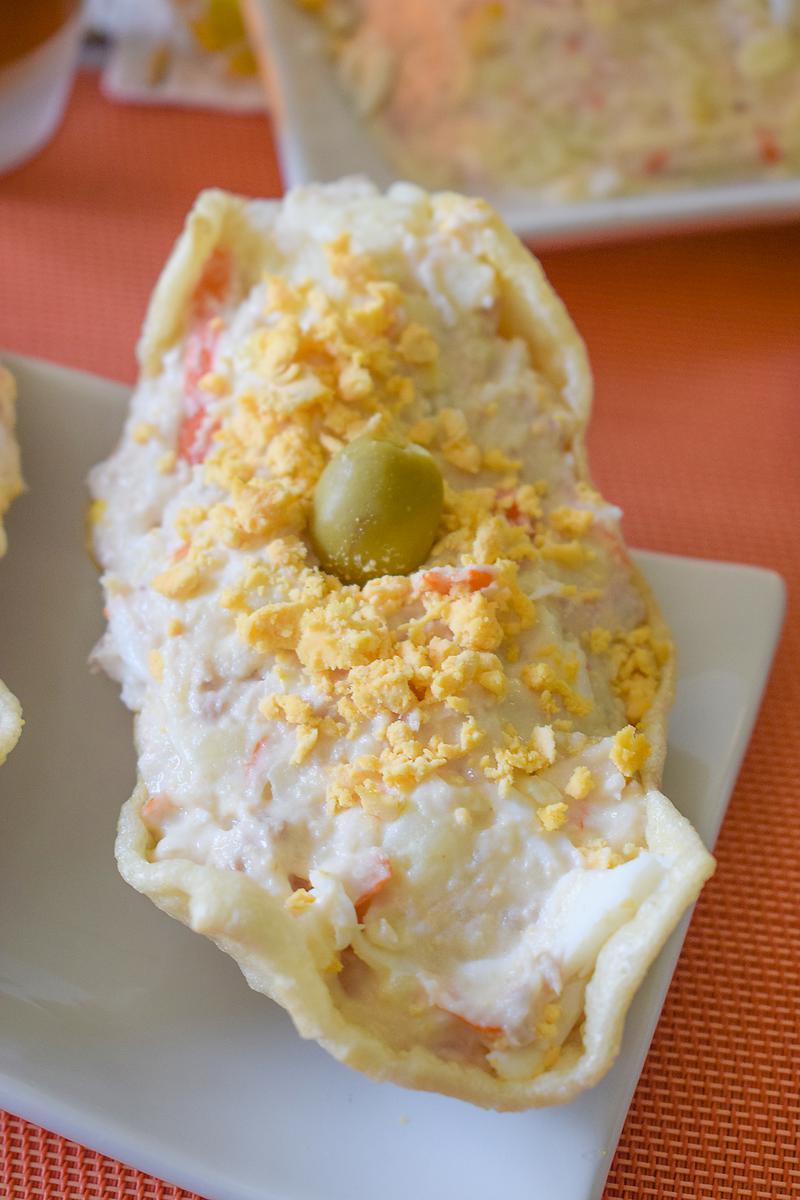 Como seguro has adivinado, el relleno y punto fuerte de las palomas, es una una buena ensalada de patatas o ensaladilla, que se presenta en crujientes cueros recién hechos.