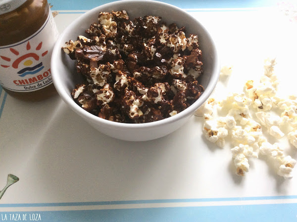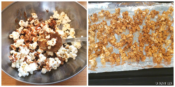 En un bol como la imagen inferior echamos el dulce de leche poco a poco encima de las palomitas, removiendo para que estén todas bien impregnadas de dulce de leche y vamos echando más palomitas y más dulce de leche, así poco a poco.