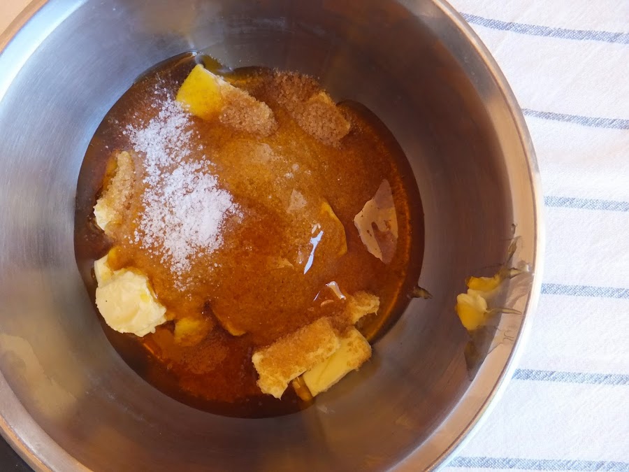 3. En un cazo pequeño, funde la mantequilla , el azúcar, el golden syrup y la sal a fuego medio alto. Mezcla, con una cuchara de madera, lo justo para que quede todo bien integrado. Cuando comience a hervir deja cocinar unos 5 minutos más sin remover. En este periodo el caramelo burubujeará bastante, espesará y adquirirá un tono dorado no demasido oscuro.