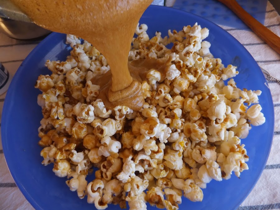 5. Vierte una parte del caramelo sobre las palomitas y mezcla con una o dos cucharas de madera. Continua añadiendo el resto del caramelo, removiendo bien tras cada adición, hasta que haya quedado bien distribuido. (No es necesario que este perfecto)