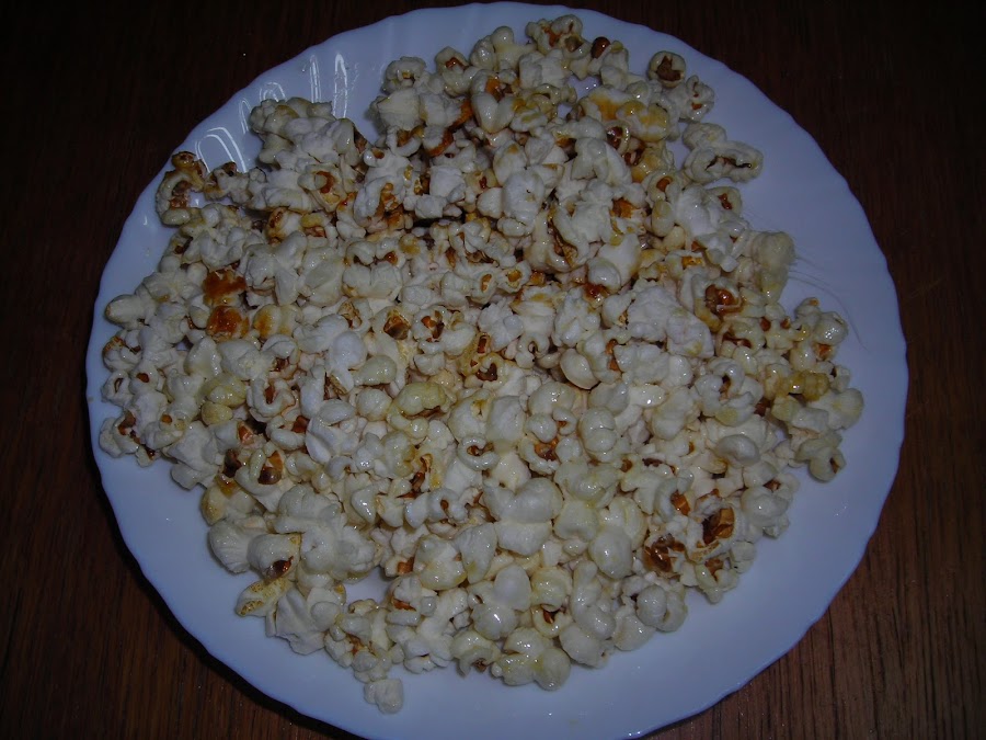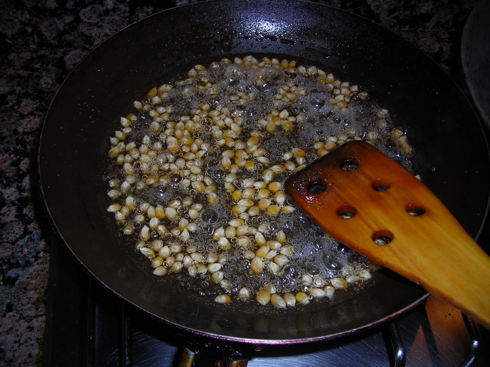 en cuanto veamos que empiezan a saltar, los tapamos con una tapadera y movemos la sarten para que el caramelo no se queme.