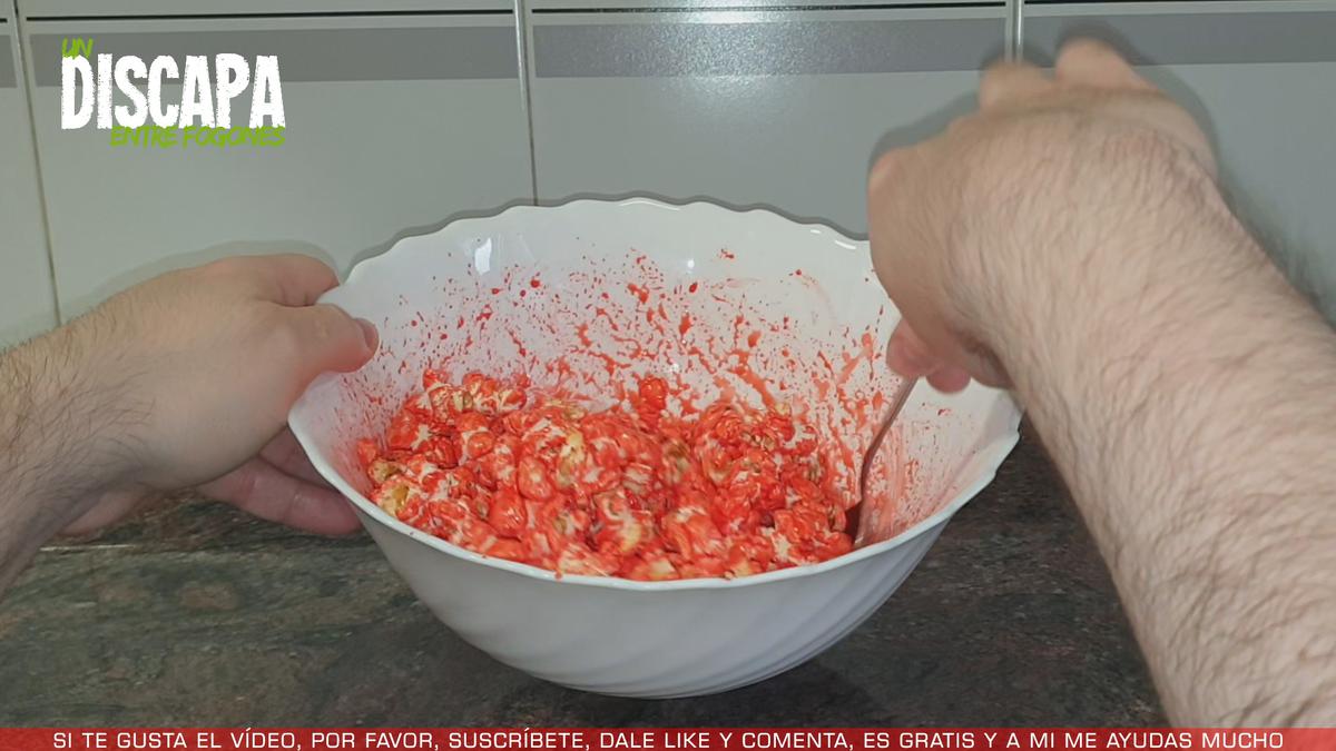 4Ahora añadimos más o menos un tercio de las palomitas en un bol amplio y añadimos el almibar con el colorante, en mi caso de color rojo y procedemos a remover las palomitas para que se impregnen bien del almibar rojo. Ahora volvemos a añadir una cantidad de palomitas a un bol amplio y repetimos la misma operación, pero con otro color, en este caso verde. Y por último terminamos con el último color que en mi caso es el azul.