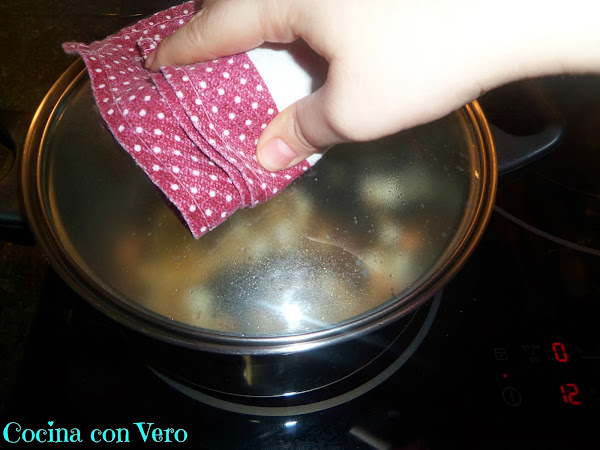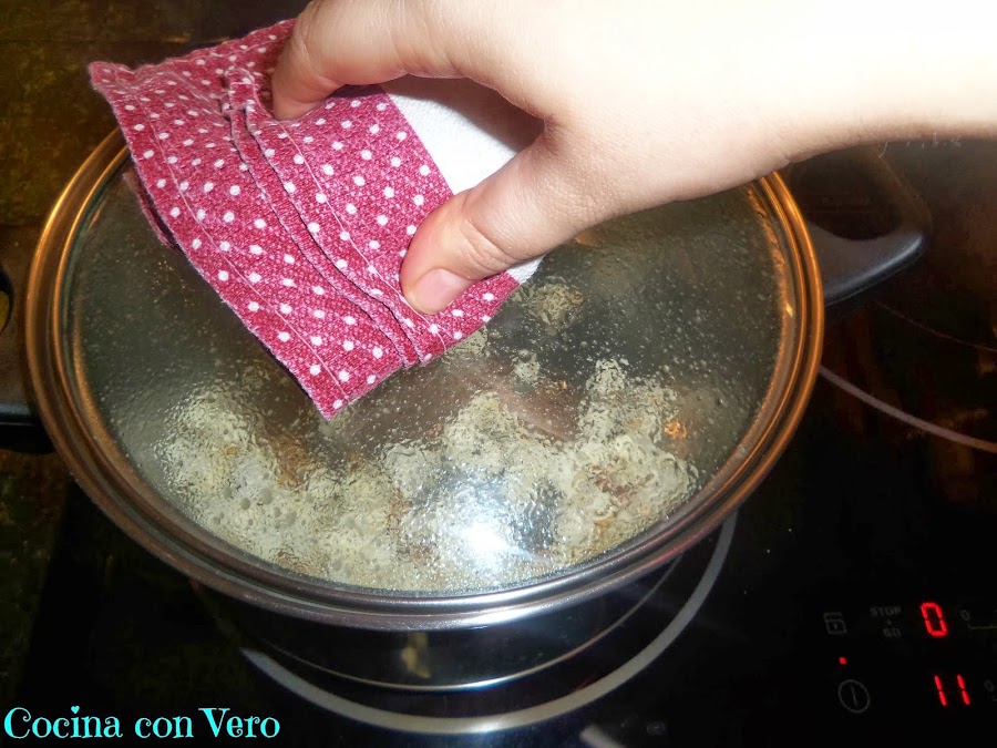 2/ Tapamos la pota y con un rodillo sujetamos el pitorro de la pota, lo ponemos a fuego fuerte y cuando empiecen a explotar los maíces bajamos el fuego poco a poco.