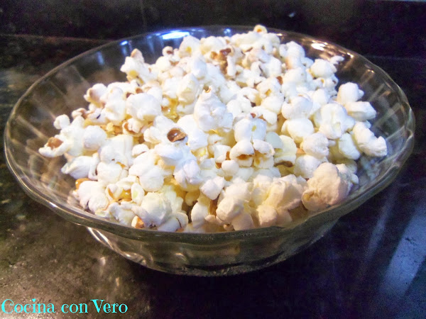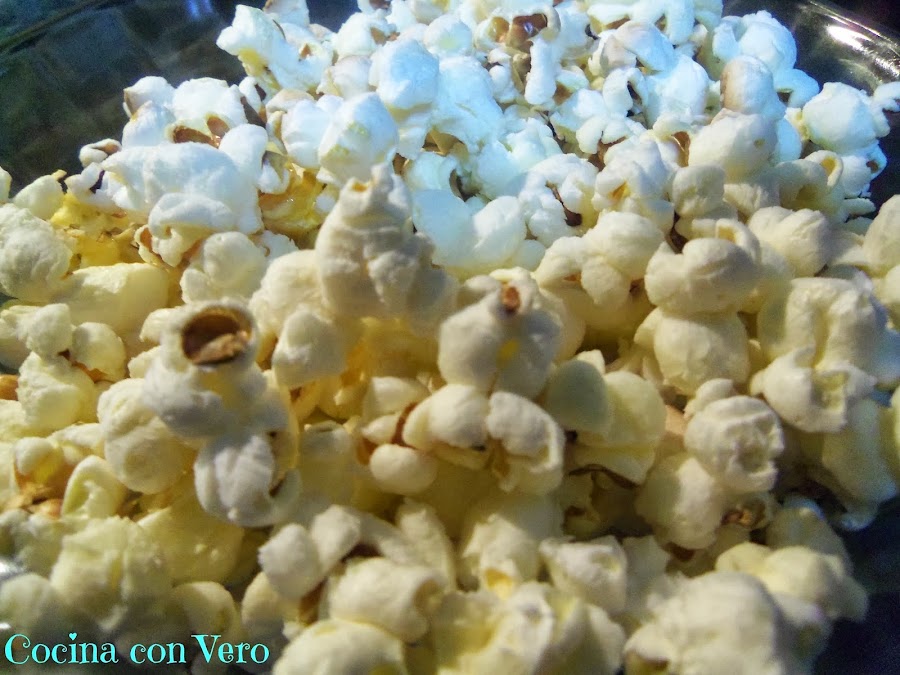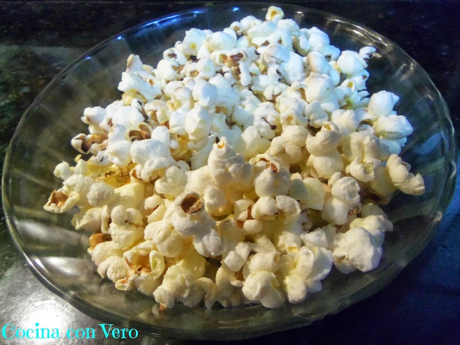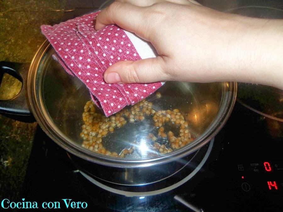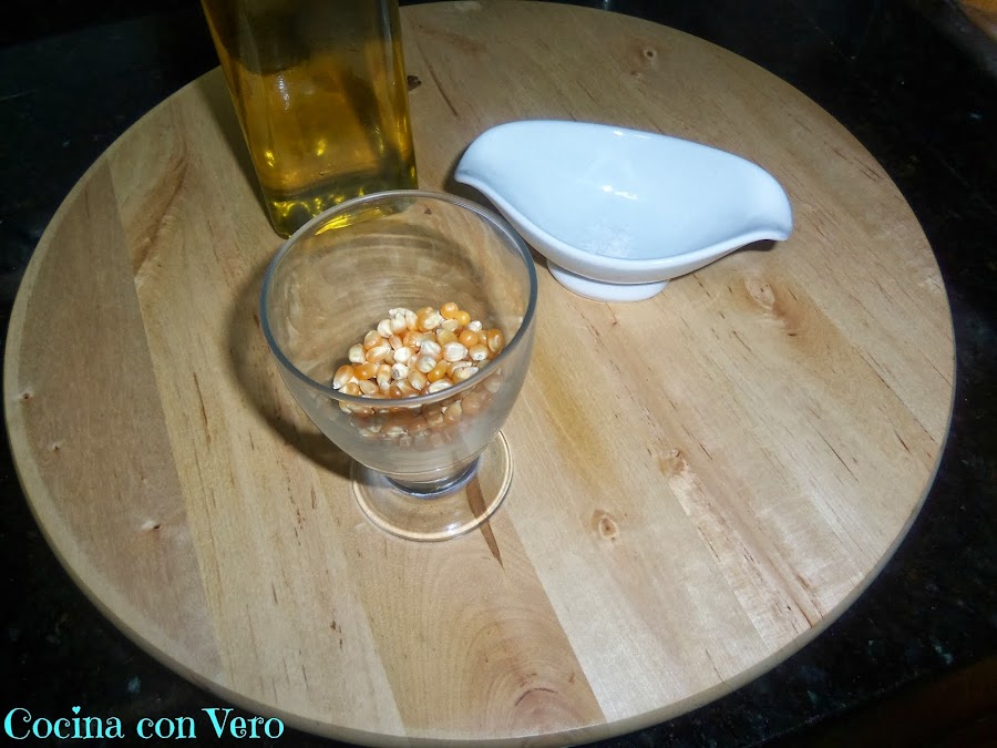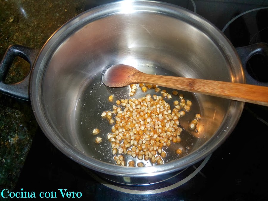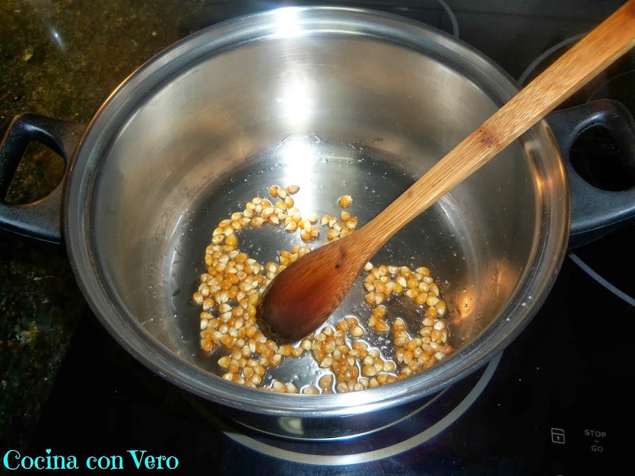 1/ En una pota grande echamos el aceite de manera que cubra el fondo con una capa muy fina, añadimos una pizca de sal y revolvemos con una cuchara de madera incluyendo los maíces para que se impregnen.