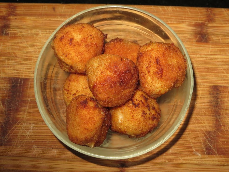 Aliñamos la carne de pollo picada con sal, pimienta, el ajo y la cebolla en polvo. Luego hacemos bolitas y las pasamos por harina, huevo y pan rallado. Las freímos en abundante aceite, sacamos a un papel absorbente y ya están listas para comer.