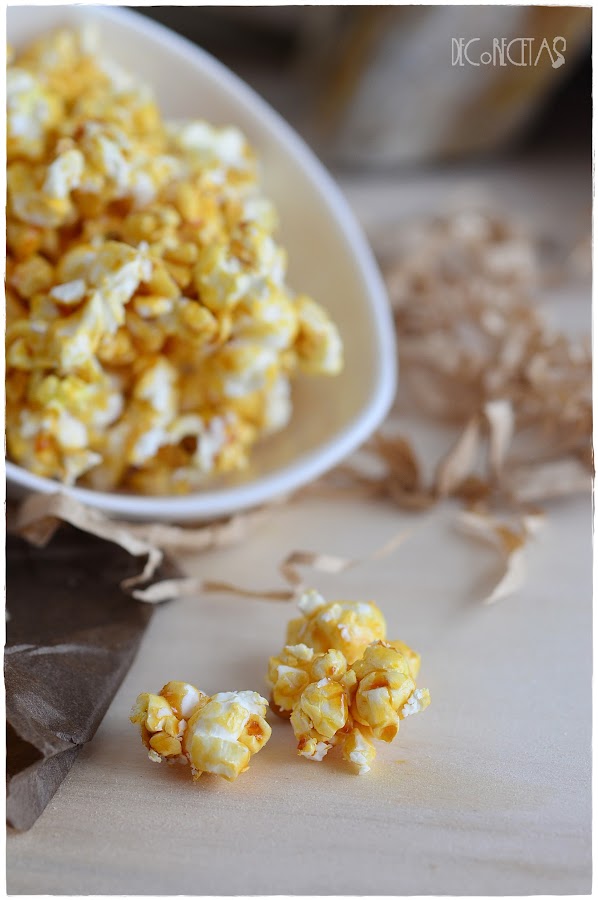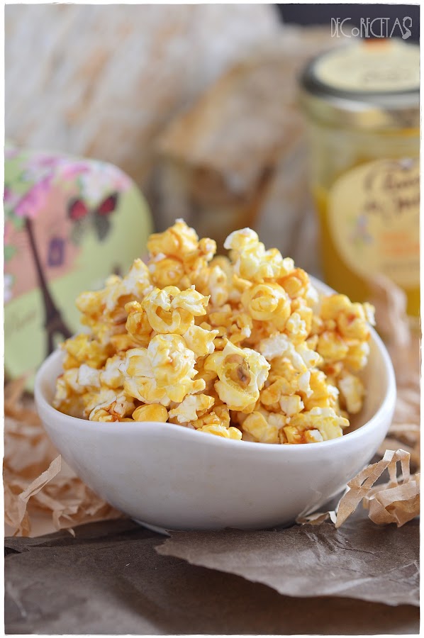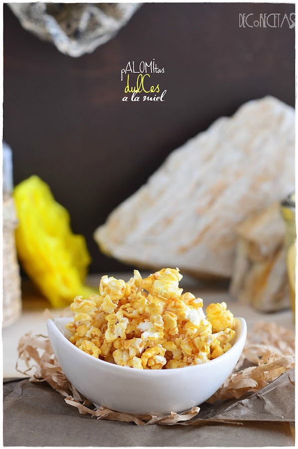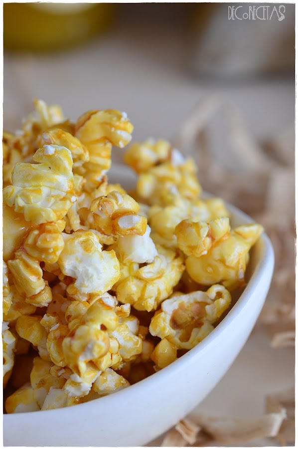 Simplemente tenemos que poner al fuego miel y dejar que hierva por un minuto. Es entonces cuando la verteremos encima de unas palomitas recién hechas removiendo todo bien para que la miel se impregne por completo y las degustamos!!