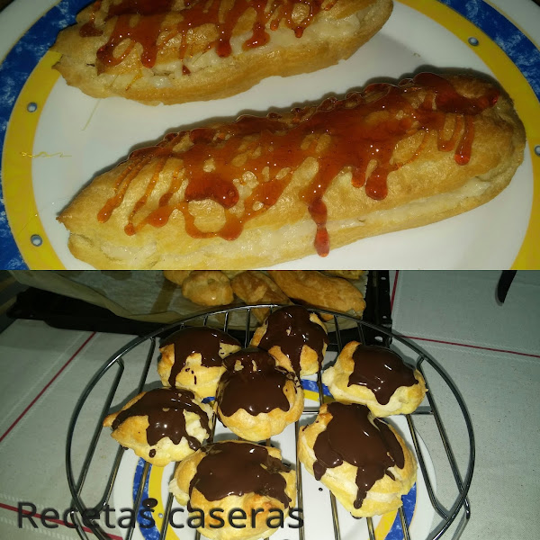 También se puede utilizar para hacer bocaditos salados. Como veis tiene infinidad de usos. yo en este caso he hecho palos catalanes y profiteroles. Unos son de crema y otros de nata (crema de leche) con cobertura de chocolate negro.