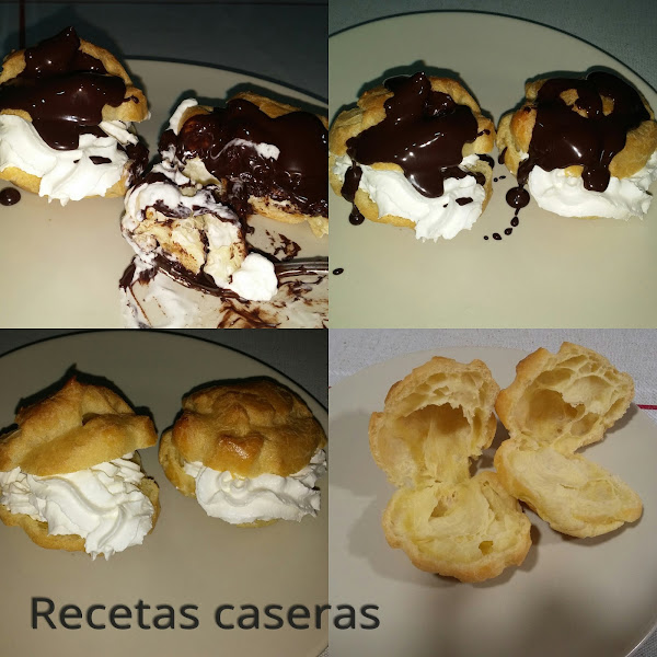 - A los profiteroles de nata (crema de leche) os recomiendo que le pongáis la cobertura de chocolate una vez que se van a consumir, por el hecho de que el chocolate este caliente.