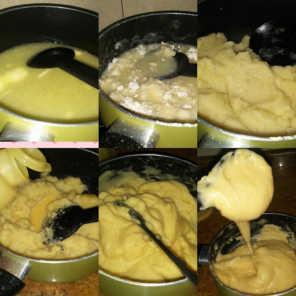 - Dejamos la pasta enfriar unos minutos. Mientras tanto batimos los huevos en un recipiente aparte. Una vez batidos, los vamos añadiendo poco a poco a la masa o pasta, removiendo constantemente. Este seria el paso mas complicado por el fuerzo que hay que hacer para mezclar los huevos a la pasta.