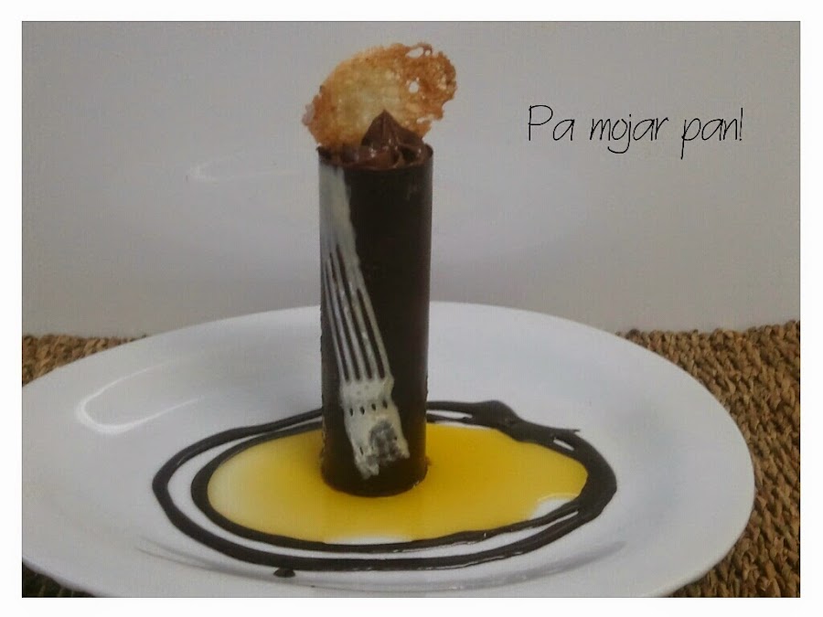 Para el montaje colocamos en el centro del plato el tubo de chocolate y lo rellenamos con la crema de chocolate que teníamos reservada en nuestra manga pastelera. Alrededor de éste ponemos un cordón fino de la salsa de chocolate y en medio de estos dos( del tubo y la salsa ) rellenamos con el aceite de oliva suave.