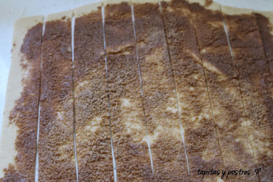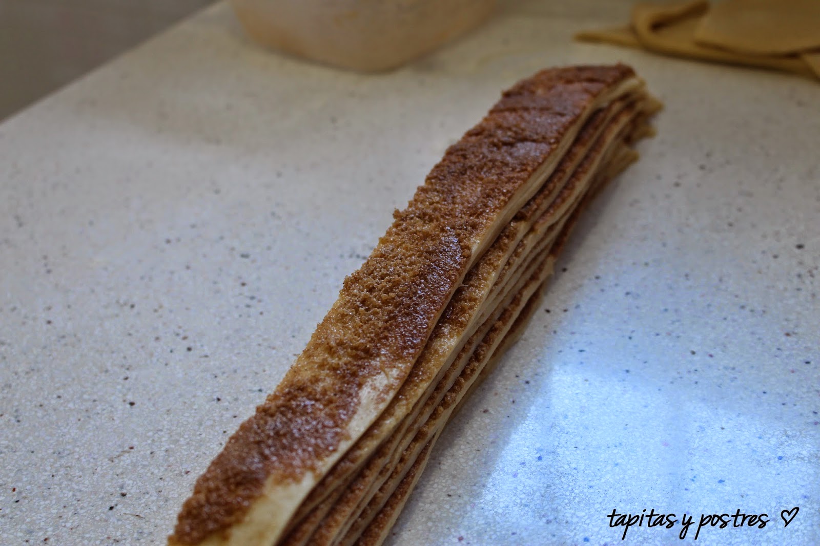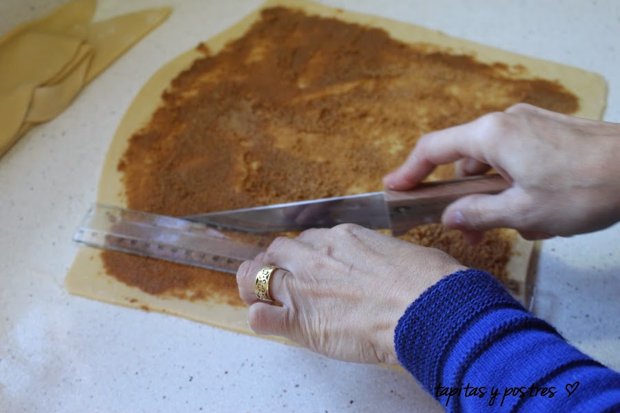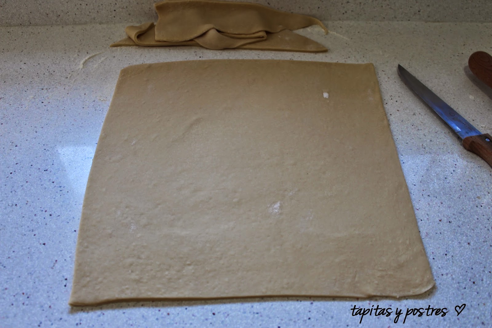 Enharinamos la mesa de trabajo con un poco de harina y estiramos la masa en forma de rectángulo. Con un cuchillo cortamos los filos, de forma que nos queden rectos.