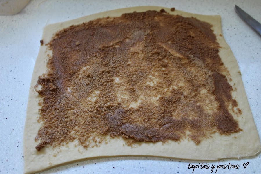 Precalentamos el horno a 200º, arriba y abajo con ventilador. Mientras pintamos con huevo batido y espolvoreamos azúcar morena por encima. Horneamos 20 minutos, pero a los diez minutos, tendréis que tapar con papel aluminio para que no se queme.