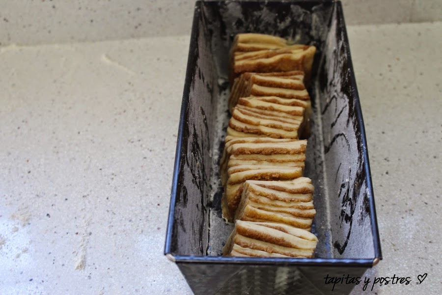 En un molde engrasado de tipo plum cake. ponemos cada cuadrado hacia arriba. Así debería quedar como un auténtico acordeón... menos el mío que me ha salido rebelde.