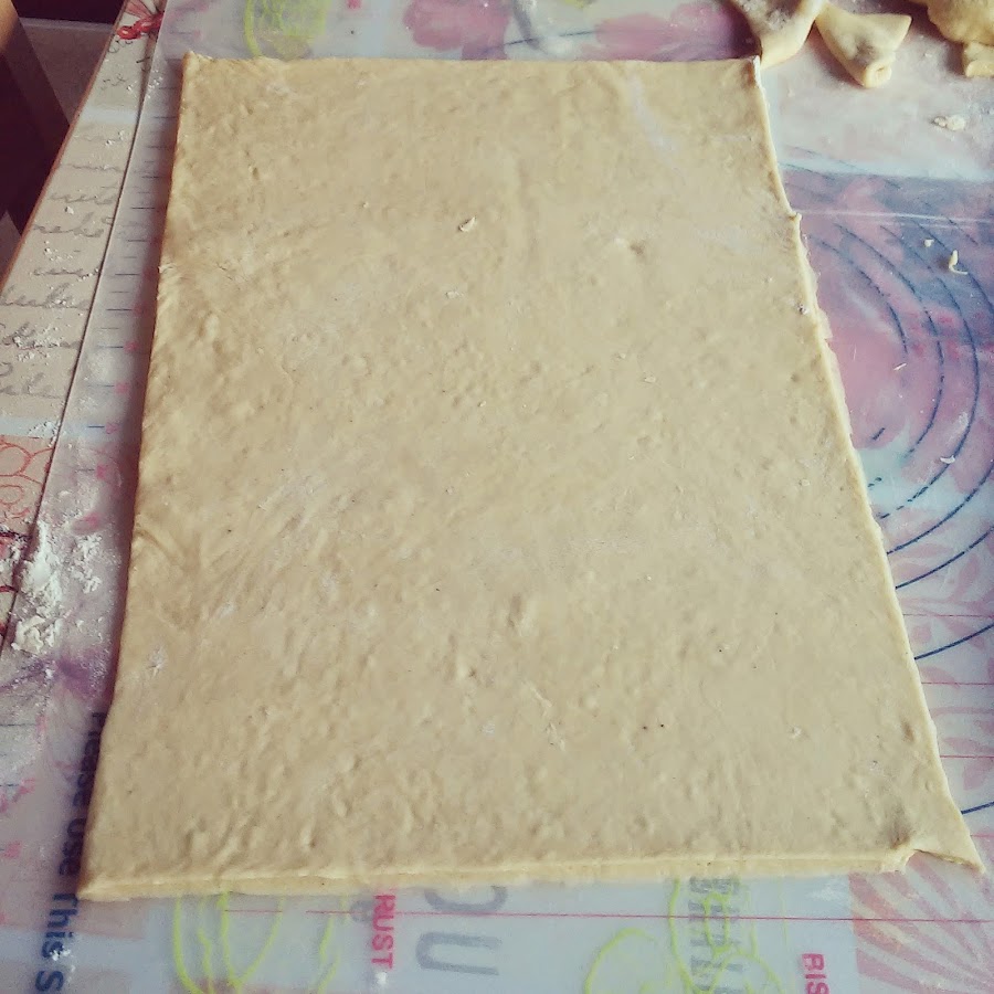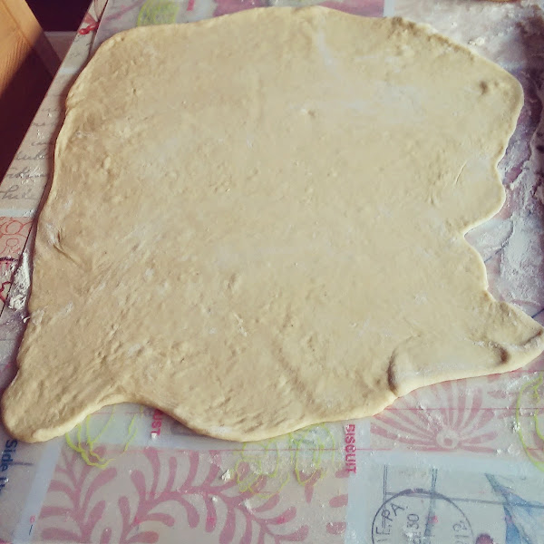 Estiramos la masa sobre una superficie enharinada. En este punto hemos de procurar no añadir mucha harina aunque nos parezca muy pegajosa, lo mejor es enharinar la superficie donde pongamos la masa y también el rodillo e ir poco a poco.