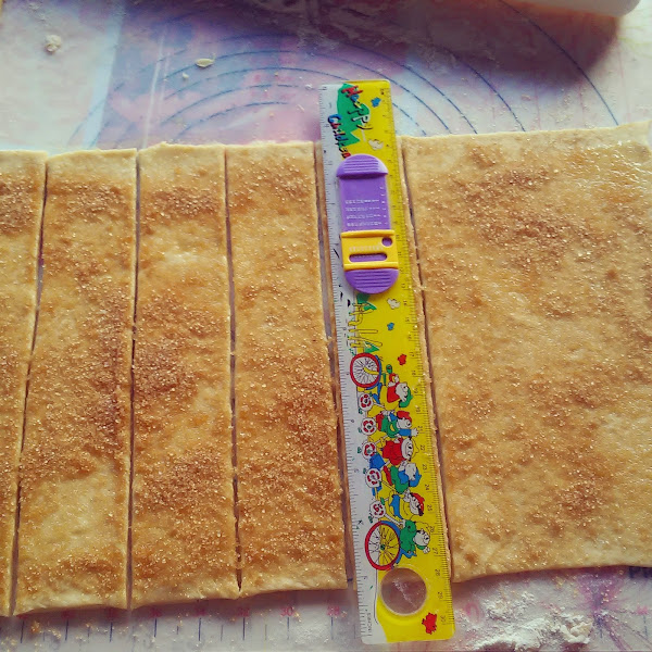 Cortamos con la ayuda de una regla bien limpita tiras regulares de unos cuatro cm.
