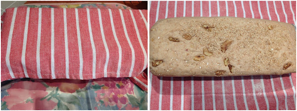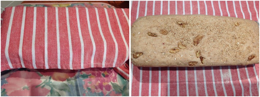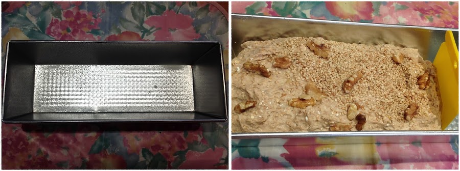 Retira la masa del vaso y coloca en un molde rectangular, decora con el muesli y sésamo reservado. Deja reposar 40 MINUTOS, hasta que doble su volumen, en un lugar seco y cálido. Yo lo tapé con un trapo.