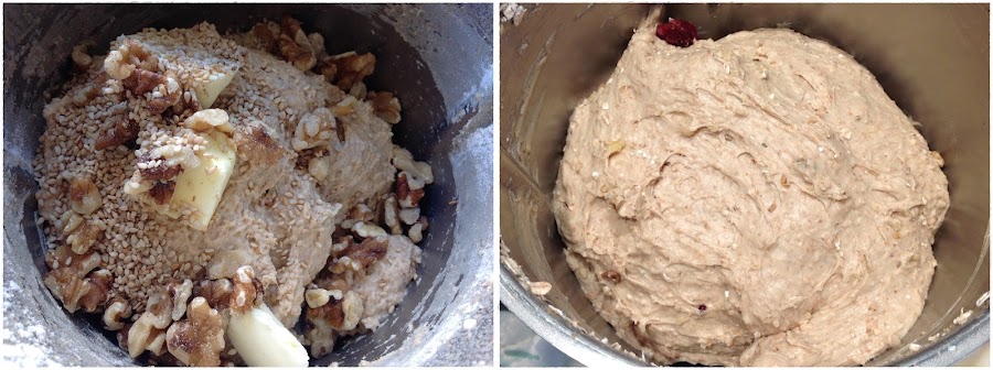 Reserva un poco de muesli y sésamo, y añade el resto junto con las nueces y la mantequilla a temperatura ambiente. AMASA / 4 MINUTOS / VEL. ESPIGA.