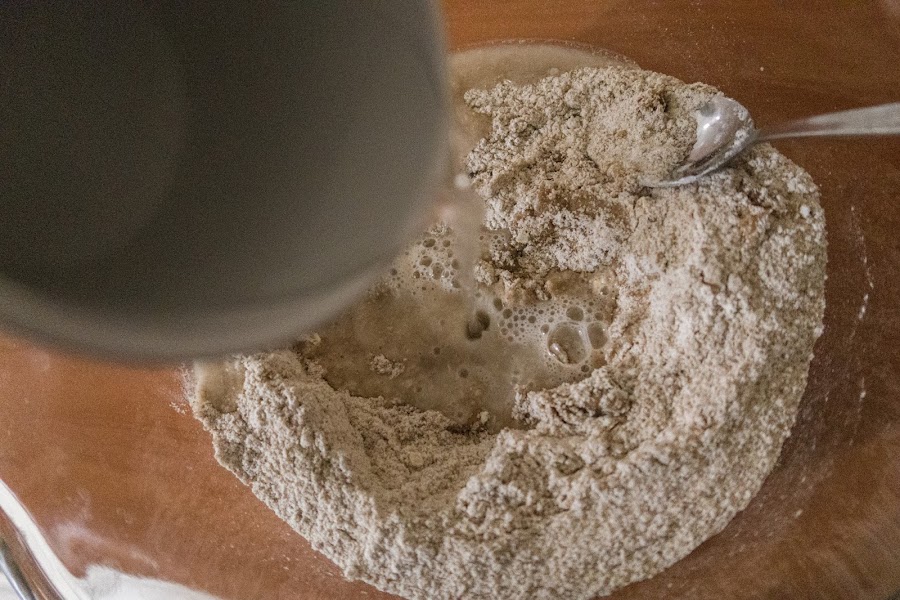 En un bowl, añadir todos los ingredientes secos (harina, levadura, sal) y hacer un agujero en el medio, como un volcán, para agregar el aceite y poco a poco incorporar el agua tibia.