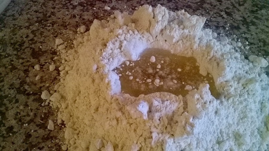 Segundo paso: Mientras tanto, hacer un volcán con la harina y la sal, hacer un hueco al medio y agregar el aceite. Luego agregar el agua tibia con la levadura y comenzar a juntar todo. Amasar por 10 minutos.