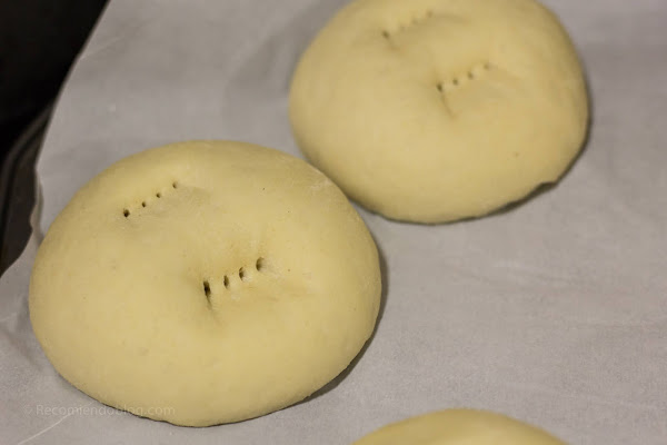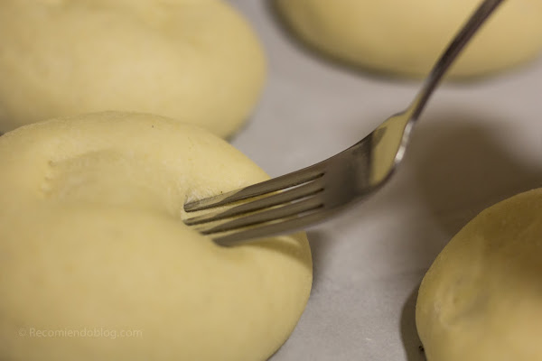 Cuando ya hayan crecido, hacer hoyitos con un tenedor y hornear (en horno precalentado, siempre), con un cuenco o pocillo pequeño con agua, para que genere vapor en el horno, por 25 minutos aproximadamente. Si tu horno es muy potente, seguro necesitarás menos tiempo)