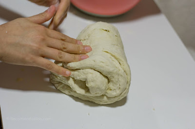 Después, voltear la masa en una superficie, y dividirla en 2 partes, y luego en 5, y formar bollitos (obviamente si quieres panes más grandes, cortas menos trozos).
