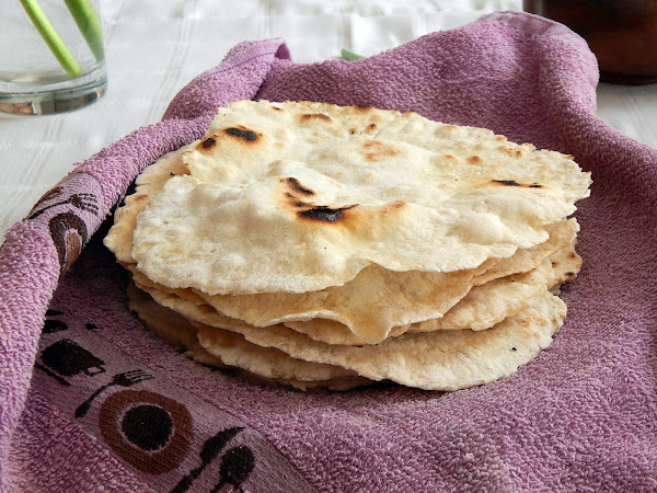 Estiramos con un poco de harina en la base y en la superficie con un rodillo, hasta que tengan 1 ó 2 mn. Ahora en una sartén o plancha caliente a fuego medio, vamos a hacer nuestro pan. El tiempo nos lo dará que empiecen a hincharse. Entonces se les da la vuelta y al cabo de un minuto, no más se sacan y se ponen en un trapo limpio. y se tapan. Hay quien humedece el trapo `previamente para que no se sequen.
