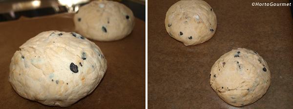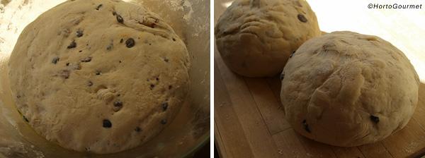 Pasado ese tiempo, preparamos una lámina de papel vegetal para hornear. Volvemos a preparar la superficie plana con harina espolvoreada. Ponemos la masa levada y la golpeamos para eliminar el aire que pueda tener. Luego, dividimos la masa en dos partes iguales y formamos dos bolas homogénas.
