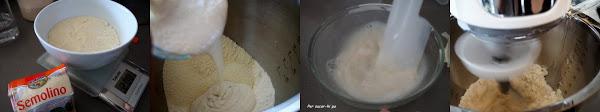 Colocar en el bol de la amasadora la harina, la semolina, la sal y la masa madre y mezclar. Añadir la disolución de azúcar y levadura e ir incorporando, mientras empieza el amasado, el resto del agua.