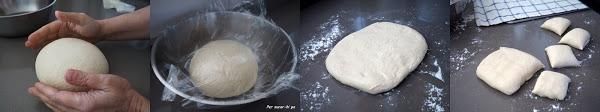 Enharinar la superficie y estirar la masa, dividirla en porciones según el tamaño que queramos para los panes. Aquí hemos hecho cuatro grandes con la mitad de las masa y ocho pequeños con la otra mitad.
