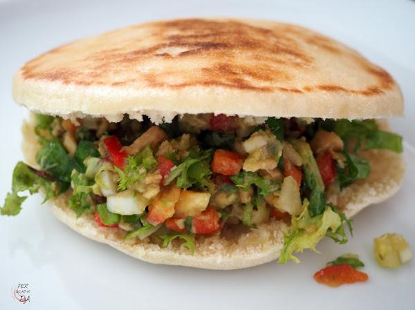 Calentar un poco el pan en una tostadora por ejemplo. Abrir por el borde con el cuchillo más o menos la mitad de la pieza, veréis que el interior queda como una bolsa. Con una cuchara rellenar el pan generosamente con la mezcla que hemos preparado. Ya está listo para disfrutar!