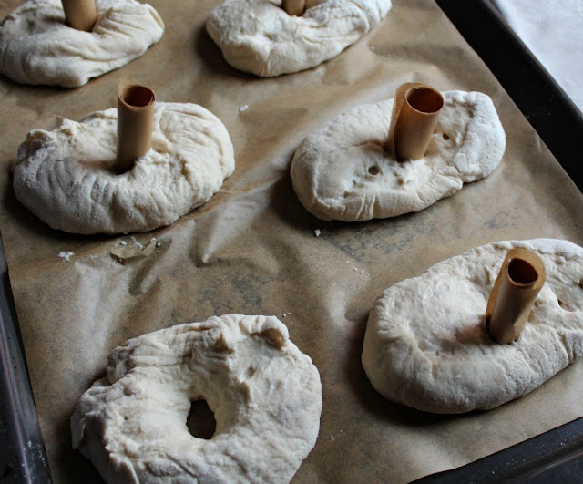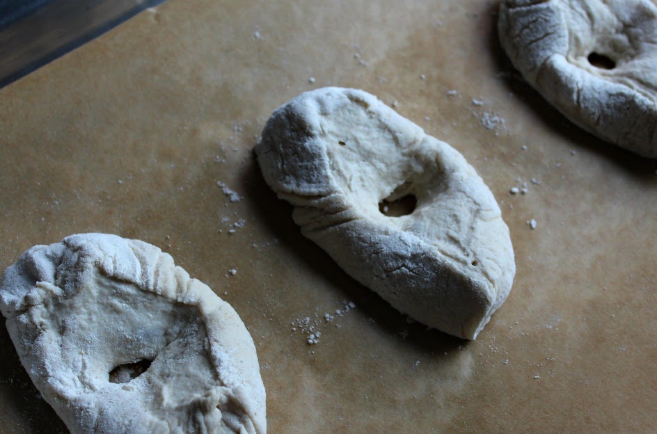 Colocamos sobre papel de hornear, hacia arriba. Abrimos cada pieza suavemente, para que parezca un "donuts".