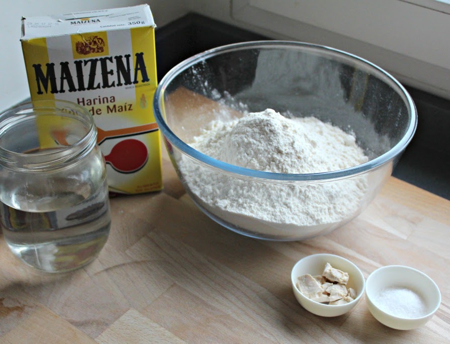 Mezclamos la harina de fuerza, con el agua y la sal. Añadimos la levadura al final, para que no contacte con la sal.