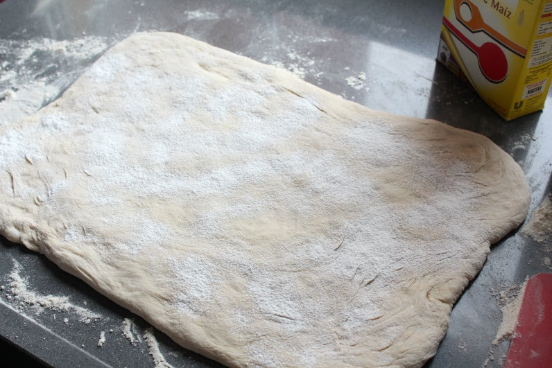 En una superficie enharinada, volcamos la masa y la aplastamos un poco, formando un rectángulo.