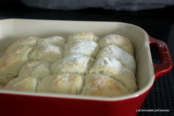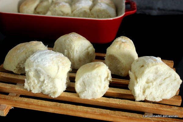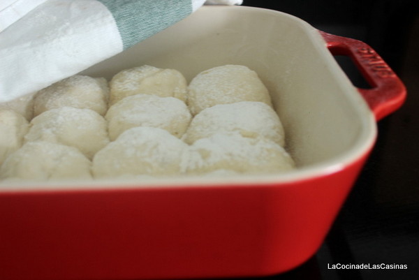 Viertes sobre los ingredientes secos, amasas hasta conseguir una masa suave y elásticas. Reservas cubierto con un paño de cocina y en lugar seco durante 45 minutos. Divides la masa en partes iguales de acuerdo al tipo de pan que quieras hacer, yo les he hecho pequeños. Untas la palma de la mano con un poco de aceite ya que la masa es pegajosa. Formas con cada uno de ellos una bola. Introduces cada una de ellas en una fuente de horno que has untado con mantequilla, pegadas una al lado de otra. Cubres con un paño y dejas reposar otros 10 minutos.