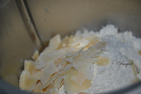 Hace un tiempo me compre un libro de recetas de pan y la verdad no lo he mirado mucho, se llama el gran libro del pan casero, así que le eche un ojo y me pareció que esta receta de pan con queso estaría rico, claro que yo le hice un cambio en el queso, el que llevaba era mas bien normalito y yo lo cambie por este con mas cuerpo y sabroso, como es el grana padano y en vez de hacerlo de forma manual, lo he hecho en la thermomix.