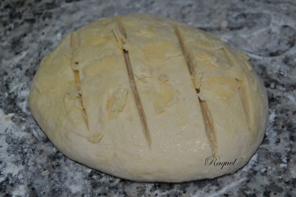 Volvemos a amasar y le damos forma de hogaza y hacemos unos cortes por encima y añadimos las lascas de queso que habíamos reservado.