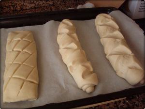 Cuando veamos la masa lista (que se nota bien por su textura) formamos las barras y le hacemos unos cortes, dejamos levar hasta que doblen su volumen.