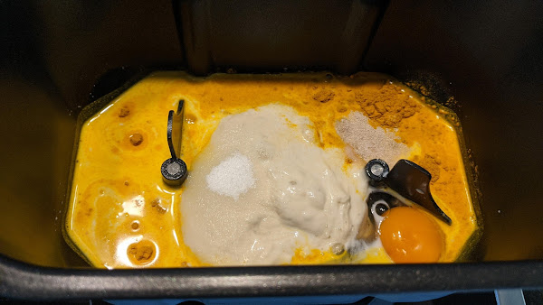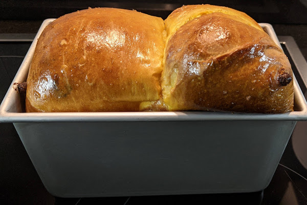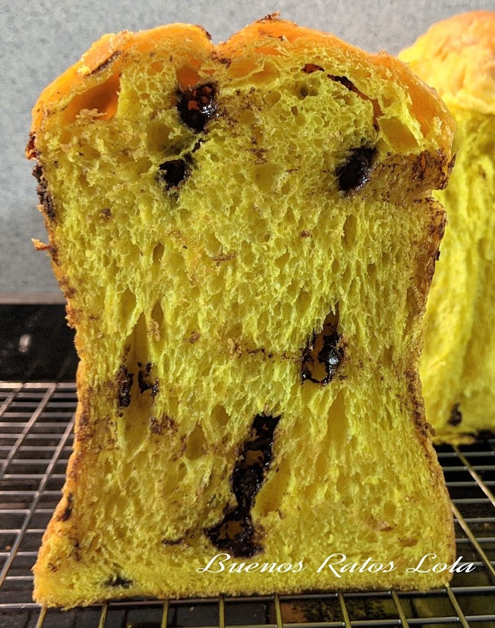 Este pan no empezó ni mucho menos como ha acabado. La idea la cogí del libro de Dan Lepard "Hecho a mano", de un pan de azafrán y pasas de corinto, hecho con poolish; y el mio lleva masa madre, cúrcuma y chocolate y además lo he adaptado a la panificadora, vamos que no tiene nada que ver con el original jejeje