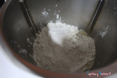 Agregamos la harina y la sal y mezclamos primero 20 segundos a velocidad a 6 y luego amasamos 3 minutos.