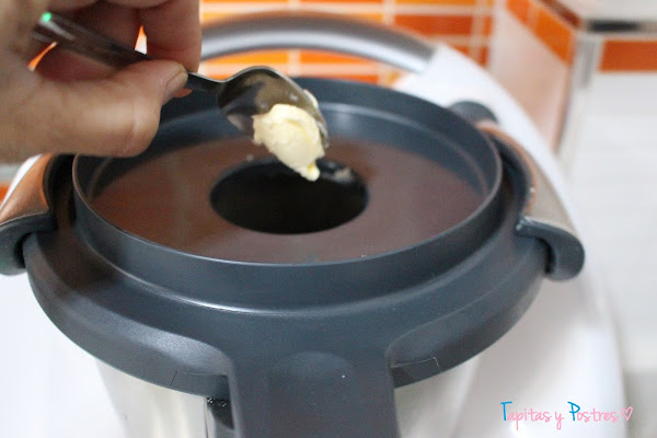 Ahora ponemos la máquina en marcha a amasar y vamos añadiendo la mantequilla a trocitos. Sin thermomix lo que hacemos es agregar la mantequilla y amasar hasta que se integre bien. Dejamos reposar dentro de vaso tapado con un paño.