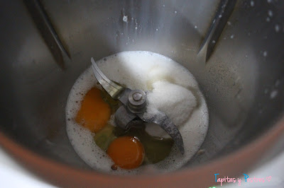 Añadimos los huevos y el azúcar y mezclamos 30 segundos a velocidad 5, Todo esto lo podemos hacer a mano mezclando bien en un recipiente.
