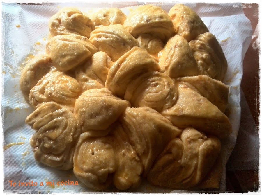 Los vamos colocando de forma dispar en un fuente de hornear redonda, y lo dejamos reposar en sitio templado hasta que vuelva a doblar su volumen.