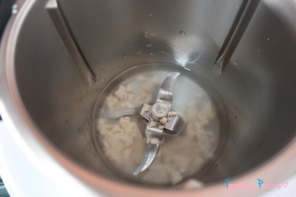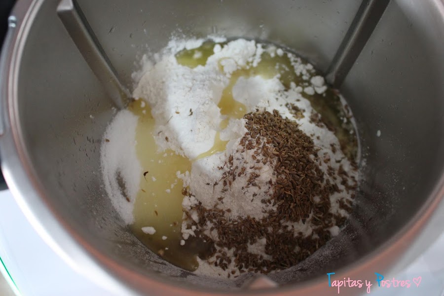 Preparamos la masa poniendo en el vaso de la thermomix el agua y la levadura desmenuzada y programamos 2 minutos, 37º y velocidad 2.